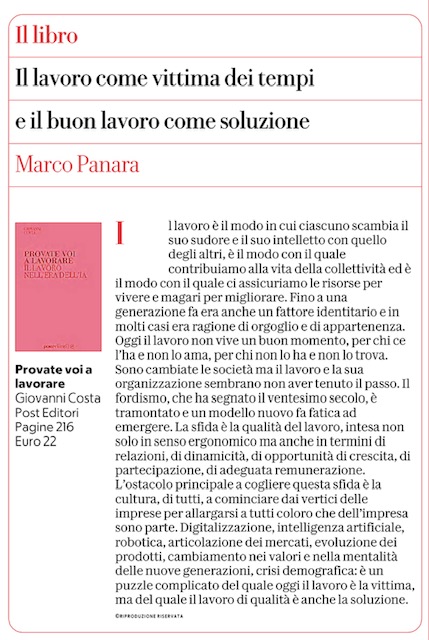 [02-11-25] Sponsor Olimpiadi invernali 2026 [26-10-25] Trasparenza retributiva tra equità e competitività [24-10-25] recensione Francesco Jori [22-10-25] Business model, investimenti, crescita [20-10-25] Recensione di Marco Panara [28-09-25] Giorgetti vs Landini [20-09-25] Against the commoditization of work [31-08-25] Declino urbano [23-08-25] Padova, Ligresti, Comandi [30-07-25] L’intelligenza artificiale e il senso del lavoro [15-06-25] Senza famiglia [25-05-25] Dalla ricerca all’innovazione [20-05-25] Capitalismo familiare: quando la famiglia non c’è più o non c’è ancora QdM n.54 [18-05-25] Partecipo ergo contratto [20-04-25] Plurale è meglio [04-04-25] Non si vive di solo export [27-03-25] Infortuni sul lavoro: gli anelli deboli [19-03-25] Buoni pasto, welfare e fisco [06-03-25] Discernimento, l’anello mancante dell’intelligenza artificiale [20-02-25] Giovani e carriere [08-02-25] Trump e la guerra dei dazi [24-01-25] Studi classici [05-01-25] Borse estere , Veneto da New York a Mumbai [30-12-24] Sotto la veste nulla ovvero le disavventure dell’employer branding in Questiion(s) de management n.51/2024 [29-12-24] La giusta mercede [15-12-24] Convergenze e ibridazione tra scienza e arte [18-11-24] Innovatori frugali [03-11-24] Non solo tagli [20-10-24] Il bancario curioso [05-10-24] Lvmh-Moncler [29-09-24] Pensioni [07-09-24] LatteBusche 70. [25-08-24] Il costo dei pasti gratis [10-08-24] Previsioni, bolle e hype [30-07-24] Chi ha paura dell’intelligenza artificiale [14-07-24] Se 50 vi sembran troppi [23-06-24] Pop economy, il rating di Taylor Swift [01-06-24] Dall’Arsenale idee da e per Venezia [21-05-24] Spin-off universitari [10-05-24] Marco Polo Guru [23-04-24] Made in Italy, non basta la parola [06-04-24] Potica industriale e Regione [19-03-24] Quando vince l’ibrido [10-03-24] Da terzisti a partner strategici [28-02-24] Lavoro al centro di cosa? [01-02-24] Laureati, istruzioni per l’uso [26-01-24] Autovelox, velocità sanzioni consenso [19-01-24] Non è un Paese per Intel [30-12-23] Giovani e carriere: ridare un senso al lavoro [30-12-23] La boulimie de Cronos et le temps structuré Question(s) de management n. 47/2023 [23-12-23] Quante volte figliolo? [10-12-23] Sostenibilità sostenibile, non basta una mano di verde [18-11-23] Crescere genitori e imprese [24-10-23] Periferie competitive [15-10-23] Artigiani, staffetta generazionale eterologa [10-10-23] Settimana corta, lavoro e tempo [24-09-23] Non si vive di solo “fare” [13-09-23] Gabbie salariali e gabbie mentali [10-09-23] Per non essere complici [19-08-23] Salario minimo [08-08-23] Governance e voyeurismo societario [30-07-23] Capitalismo senza capitalisti [24-06-23] Berlusconi [28-05-23] Imprese e sindacati. Un patto per contare [21-05-23] Globalizzazione flessibile [17-05-23] Le vendette del mercato [06-04-23] Resilienza e diversità [26-03-23] Il valore della presenza [20-02-23] Chat GPT [12-02-23] Nuovo capitalismo manageriale [22-01-23] Il lavoro come servizio [07-01-23] Lavoro mercato conflitto [12-12-22] Filiere [08-12-22] Alla ricerca del tempo (lineare) perduto - Questions de Management n.41 2022 [30-11-22] Aggregazioni [26-11-22] Autonomia e identità [21-11-22] Capitalisti riluttanti [19-10-22] Imprese famigliari [12-10-22] Sicurezza del lavoro e nel lavoro [05-10-22] La parola alle imprese [04-09-22] Occupazione e maternità. [20-08-22] Nessuno mi può giudicare. Valutazione insegnanti. [11-08-22] Pensionati ed economia circolare [30-07-22] Made by Italians [19-07-22] Mercato e relazioni [08-07-22] Welfare e cuneo fiscale [29-06-22] Leonardo Del Vecchio [29-05-22] La forza di andare oltre [23-05-22] Siagri e la service transformation [24-04-22] Assicurazioni generale, il potere, le idee e i numeri [13-04-22] Gestire il rischio filiere [07-04-22] Chi difende i talenti del fare? [25-03-22] Hamburger vs missili [19-03-22] Copycats, copiare ai tempi di Internet [06-03-22] Posto fisso [01-03-22] Rivista Aidp La strada di fronte a noi [20-02-22] Nostaglia della scala mobile? (Corriere del Veneto/Corriere della Sera 20/02/22) [12-02-22] Etica della crescita. Manifattura e servizi in concerto [26-01-22] Capitalismo sostenibile: la sostenibilità secondo Black Rock [05-01-22] Il Veneto festeggia in Borsa [04-12-21] L’impresa come racconto [26-11-21] La lectio di Ennio. Ricordo di Ennio Doris (1940-2021) [31-10-21] Gerundio, maneggiare con cura [14-10-21] Verso una nuova globalizzazione [28-09-21] Aprire il capitale e le menti [07-09-21] Baratta e la Biennale. Economia e cultura in Laguna [27-08-21] Caso Lotto, la proprietà e le sue varianti [19-08-21] Infortuni sul lavoro: fatalità, colpevoli, complici [11-08-21] Economia circolare in banca: allungare la vita attiva della carta accorciare quella del bancario? [06-08-21] Attirare investimenti esteri senza bloccare l’exit [30-07-21] Riforme senza cambiamento [14-07-21] Mediare, soluzione o problema? [01-07-21] Questions de Management n.34/2021 “Tre lezioni dalla pandemia” [23-06-21] Governare la filiera [08-05-21] Ripresa, il nodo materie prime e semilavorati [24-03-21] Il profitto tra etica e finanza [18-03-21] Didattica, dare un senso alla distanza [28-02-21] Se l’azienda si fa distretto [17-02-21] Risparmio, il lato B del debito [06-02-21] Aziende a lezione dal covid [30-01-21] Oltre la spritz economy [21-01-21] Oltre l’immunità di gregge [30-12-20] Il carciofo, la manovra e i leader [10-12-20] Du fordisme au cloudisme ou les vertus de l’ubiquité in Question(s) de management n. 30/2020 [06-12-20] Una, cento, mille task force [03-12-20] Espatriati [18-11-20] Culture d’impresa [04-11-20] Il monito del vulcano e le filiere globali (sul libro di Federico Fubini) [29-10-20] Scienziati, zanzare e politica [20-10-20] Pandemia, teledidattica, trasporti [15-10-20] Ammortizzatori o propulsori? [18-09-20] La via emiliana alla biodiversità aziendale [12-09-20] Ivano Beggio e la sua Aprilia [04-09-20] Non di solo export [30-07-20]